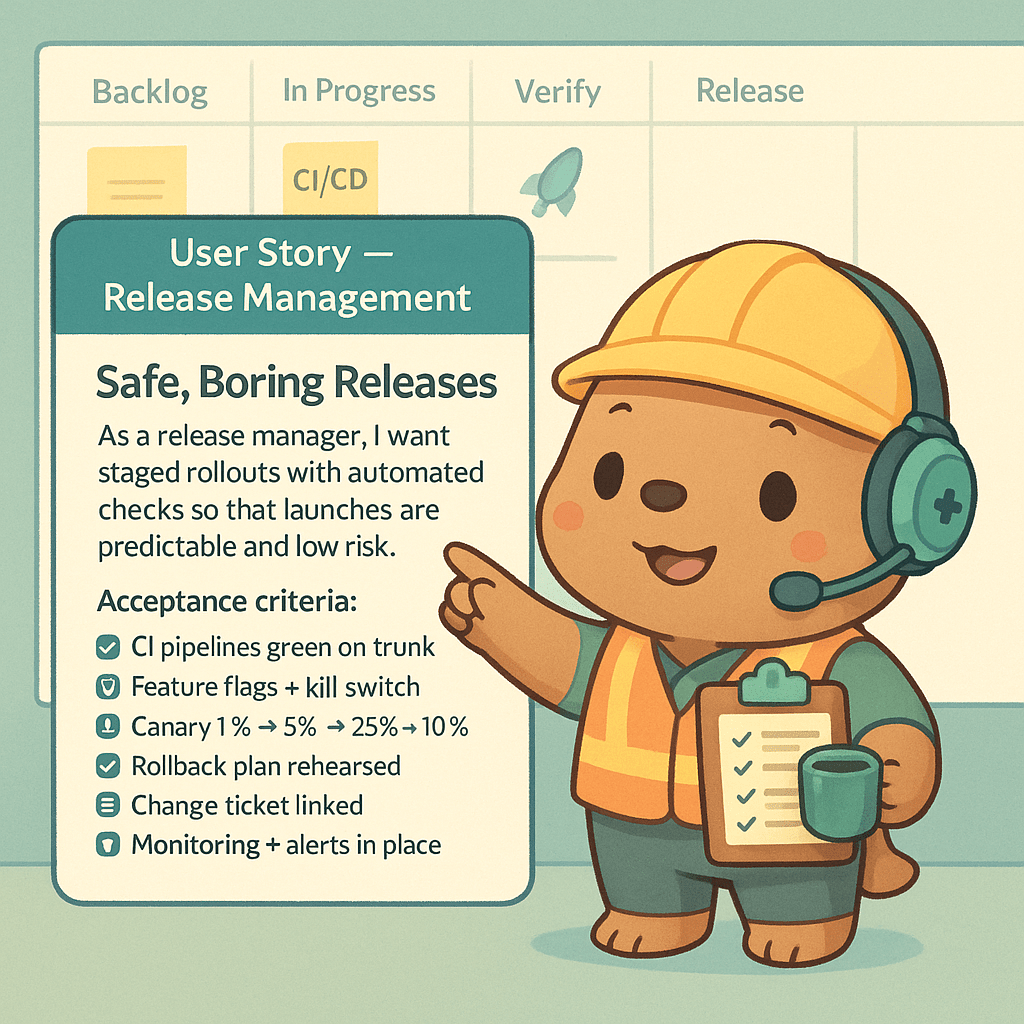 - As a release manager, I need pre‑defined rollout stages and go/no‑go metrics so we can pause or roll back without arguing during an incident.